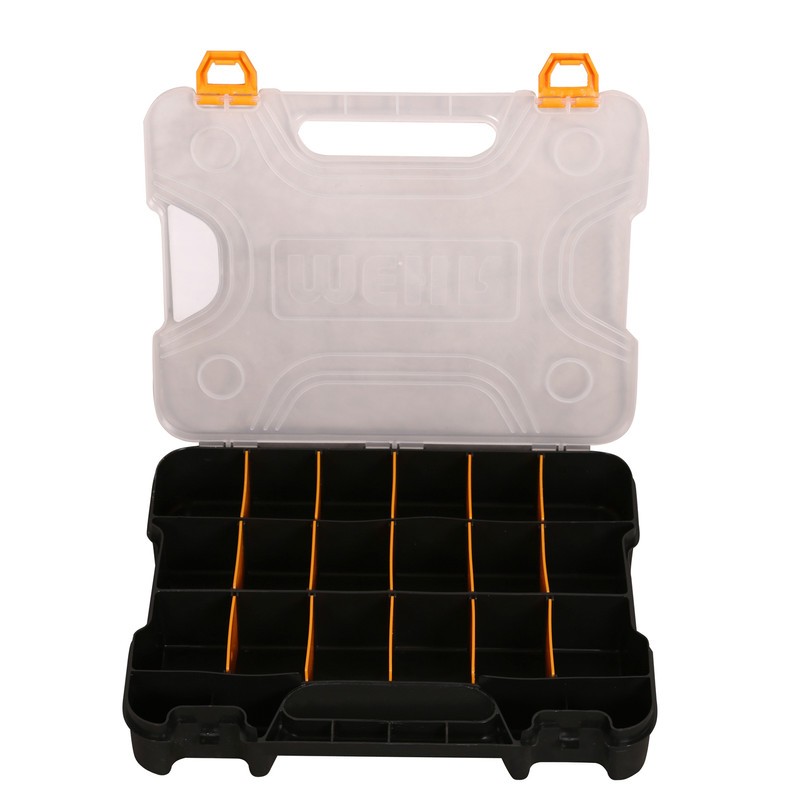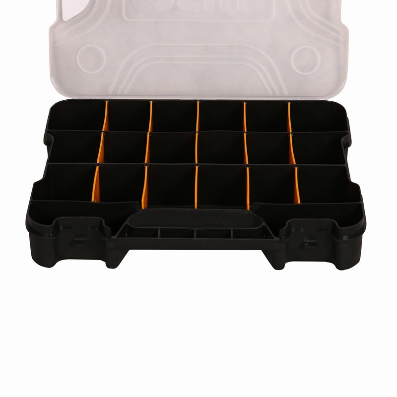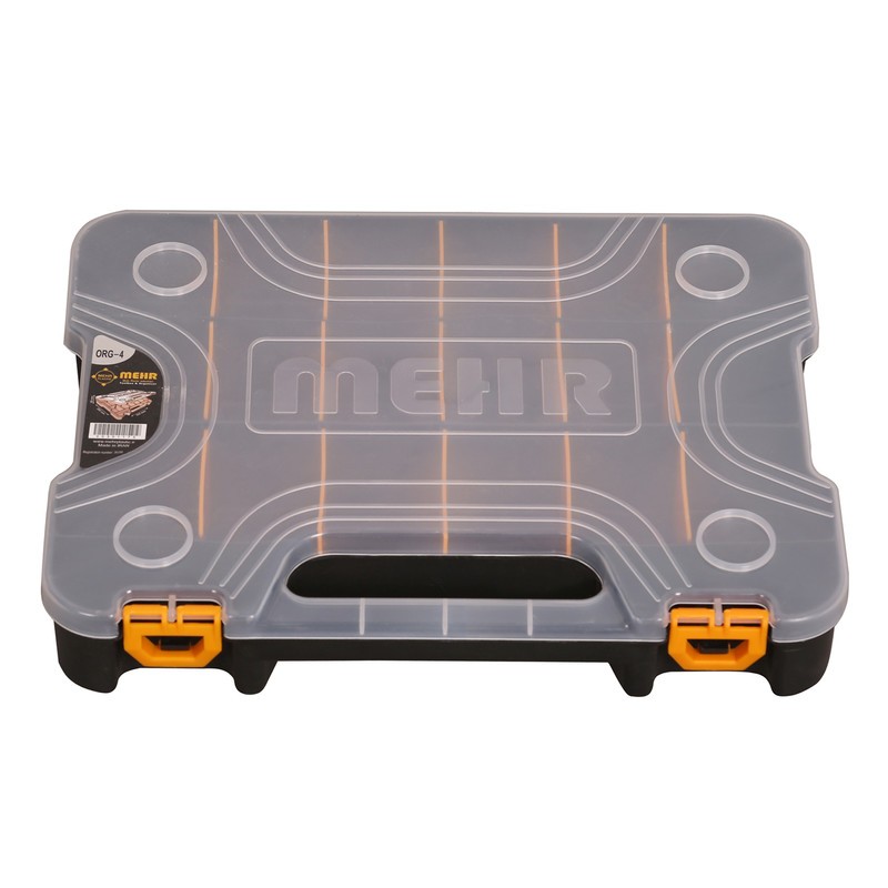 جعبه ارگانیزر مهر با قابلیت تفکیک اقلام کوچک ابزار و وسایل کوچک کارگاهی اعم از میخ ، پیچ، مهره، واشر، چسب، پرچ، بست و… دارای 18 محفظه متوسط و 4 محفظه کوچک می باشد. این جعبه دارای دو قفل پلاستیکی جهت بستن درب جعبه می باشد.