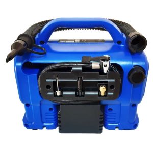 کیفیت عالی با کاربری ساده، مهم ترین ویژگی این دستگاه است که دو سیلندر جهت تولید هوا با قدرت 150 پاسکال این ویژگی را تکمیل کرده است. وجود 2 سیلندر در پمپ بادی یا مینی کمپرسور قابلیت استفاده برای خودروهای نیمه سنگین و باری مانند وانت، مینی بوس و ون را مهیا کرده است و در زمان بسیار کوتاهی لاستیک ها را باد می کند. این پمپ باد دارای یک گیج است که میزان فشار خروجی و باد تزریق شده را نمایش می دهد که بازه ای 0 تا 150 پوند بر اینچ است. وزن سبک، حجم کوچک و ساکی که در آن تجهیزات اصلی به همراه قطعات جانبی تعبیه شده است نهایتا ابعادی بسیار کوچک را ارائه می دهد که می توان به راحتی در گوشه ای از ماشین جای داد. حجم باد خروجی مینی کمپرسور برابر 60 لیتر بر دقیقه است که می توان به کمک نازل هایی که در ابعاد و اشکال مختلف است هر نمونه لاستیک و یا قطعه ای که قابل باد کردن باشد را باد نمود.