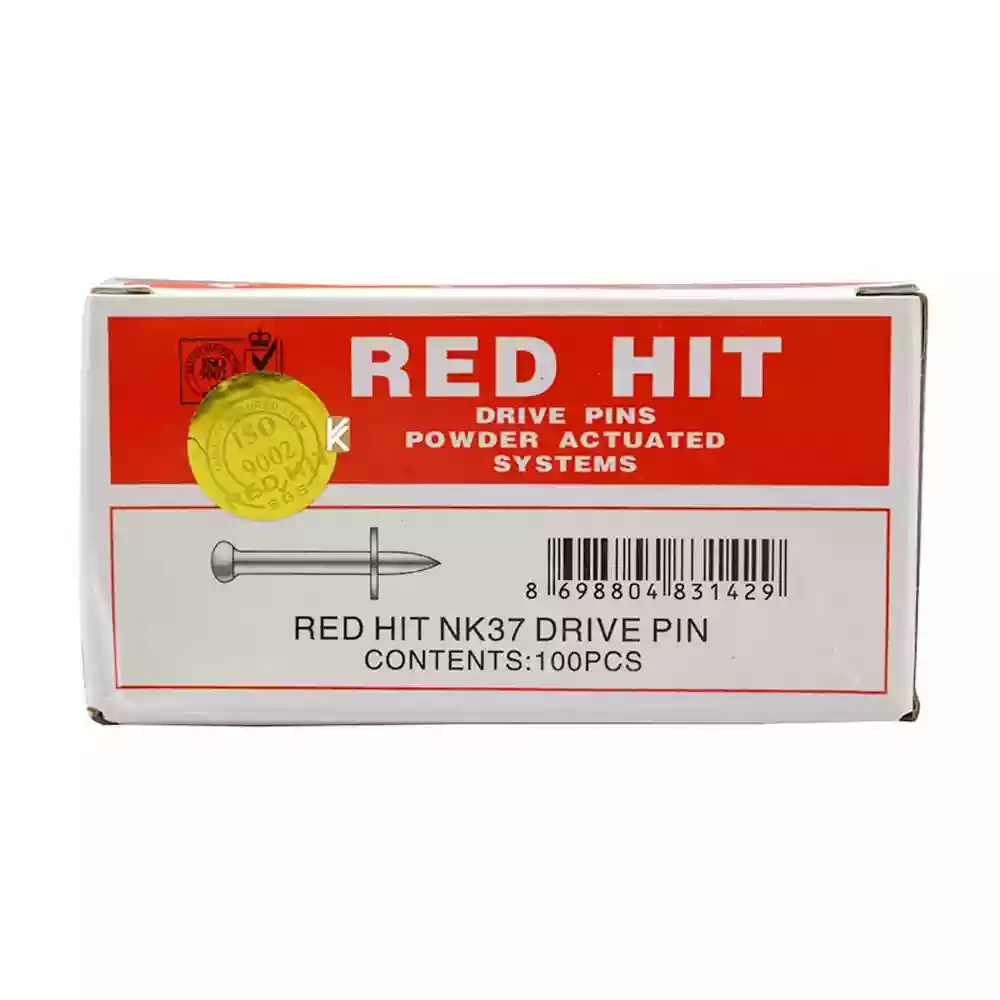 مجموعه کامل میخ ۳۷ میلیمتر + چاشنی قرمز ردهیت RED HIT (کد H – High Quality) برای نصب ورق ۱–۵ میلیمتر روی بتن و فولاد – قویترین گزینه برای اتصالات سنگین و محکم با تفنگ میخکوب تکشات.