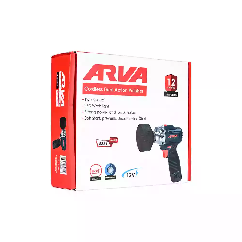 پولیش شارژی آروا ۵۸۸۶ با موتور قدرتمند، گیربکس دو سرعته اوربیتال، سرعت ۱۹۵۰–۵۸۵۰ دور در دقیقه و صفحه ۱۵۰ میلیمتری، بهترین انتخاب برای پولیش و واکس بدنه خودرو، مبلمان، فلزات و حتی سنگ است. وزن سبک، ۲ باتری و دسته جانبی، کار طولانی را راحت و لذتبخش میکند.