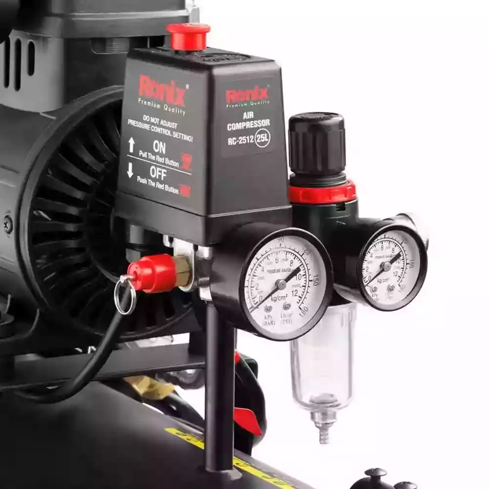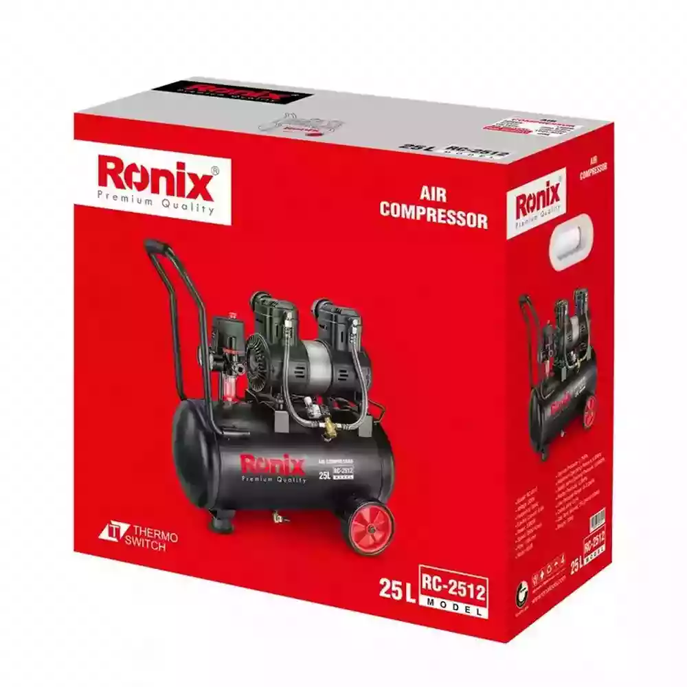 کمپرسور باد سایلنت RC-2512 رونیکس با موتور القایی اویلفری ۱۳۸۰ وات، مخزن ۲۵ لیتری، فشار ۰.۸ مگاپاسکال و صدای فوقالعاده کم، ابزار حرفهای برای بادزنی ابزار بادی، پاشش رنگ، تمیزکاری و کارهای کارگاهی/صنعتی سنگین.
