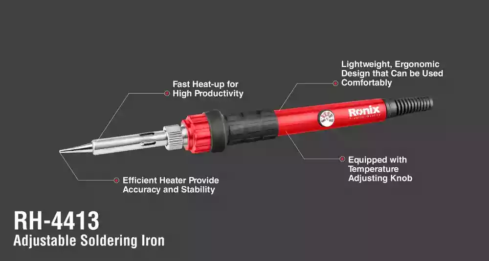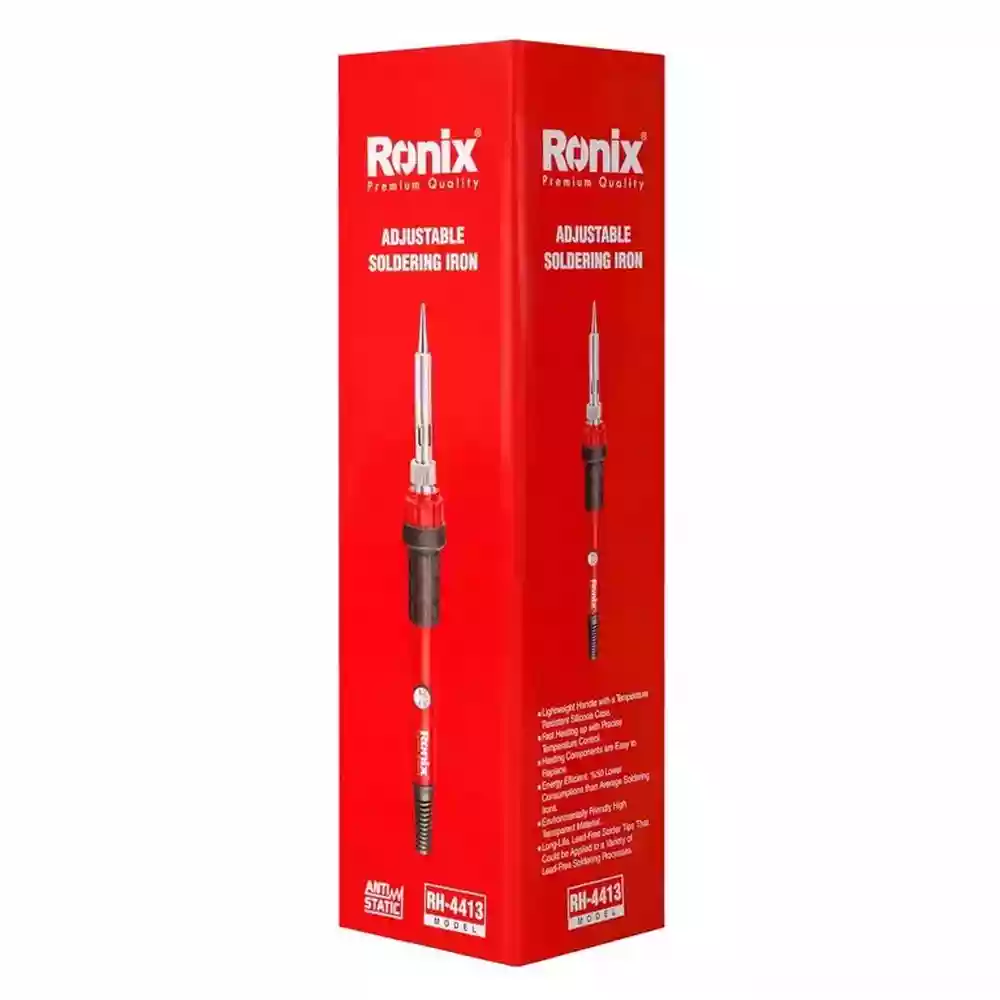 هویه قلمی حرفهای RH-4413 رونیکس با توان ۶۰ وات، تنظیم ترموستاتیک دما، نوک مس خالص ۹۰۰M-T-B و دسته سیلیکونی ضدحرارت، ابزار دقیق و بادوام برای لحیمکاری الکترونیک، تعمیرات و کارهای حرفهای.