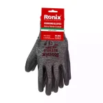 دستکش ایمنی RH-9004 رونیکس با روکش نیتریل شیاری، نخ پلیاستر ملانژ و رنگ مشکی/طوسی، انتخاب حرفهای برای کارهای عمومی، جابجایی اجسام روغنی/مرطوب و محیطهای صنعتی با نیاز به گیرش قوی و حفاظت بالا.
