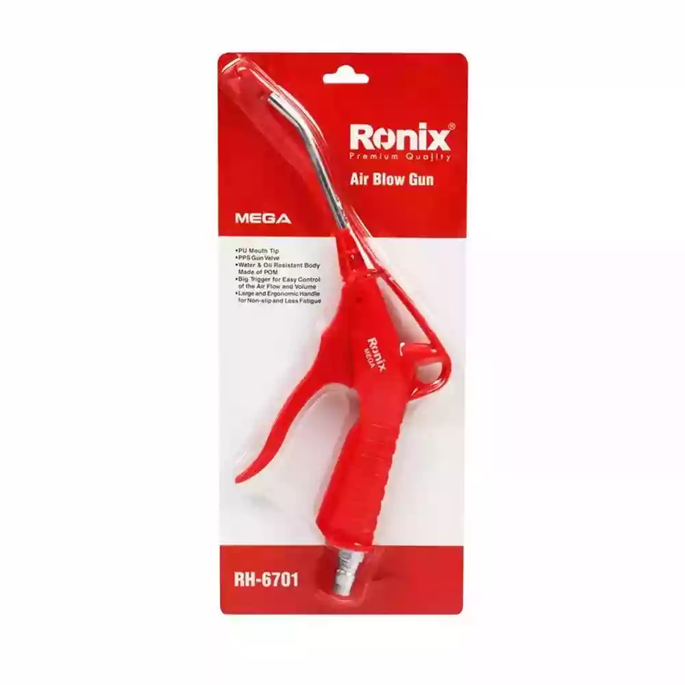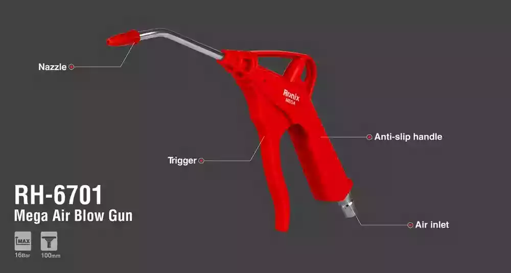 تفنگ بادپاش حرفهای رونیکس RH-6701 با نازل ۱۰۰ میلیمتری قابل تنظیم، ماشه بلند ارگونومیک و بدنه مقاوم POM، قویترین بادپاش بازار برای پاکسازی کارگاه، خودرو، کامپیوتر، دستگاههای صنعتی و هر جایی که گردوغبار جمع میشود.